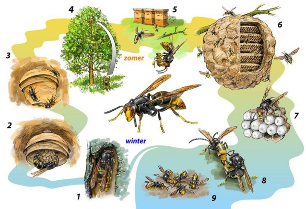 De jonge koningin zoekt een plekje om te overwinteren, dit kan zijn op een beschut plekje in vermolmd hout zoals ook in de houtstapel.